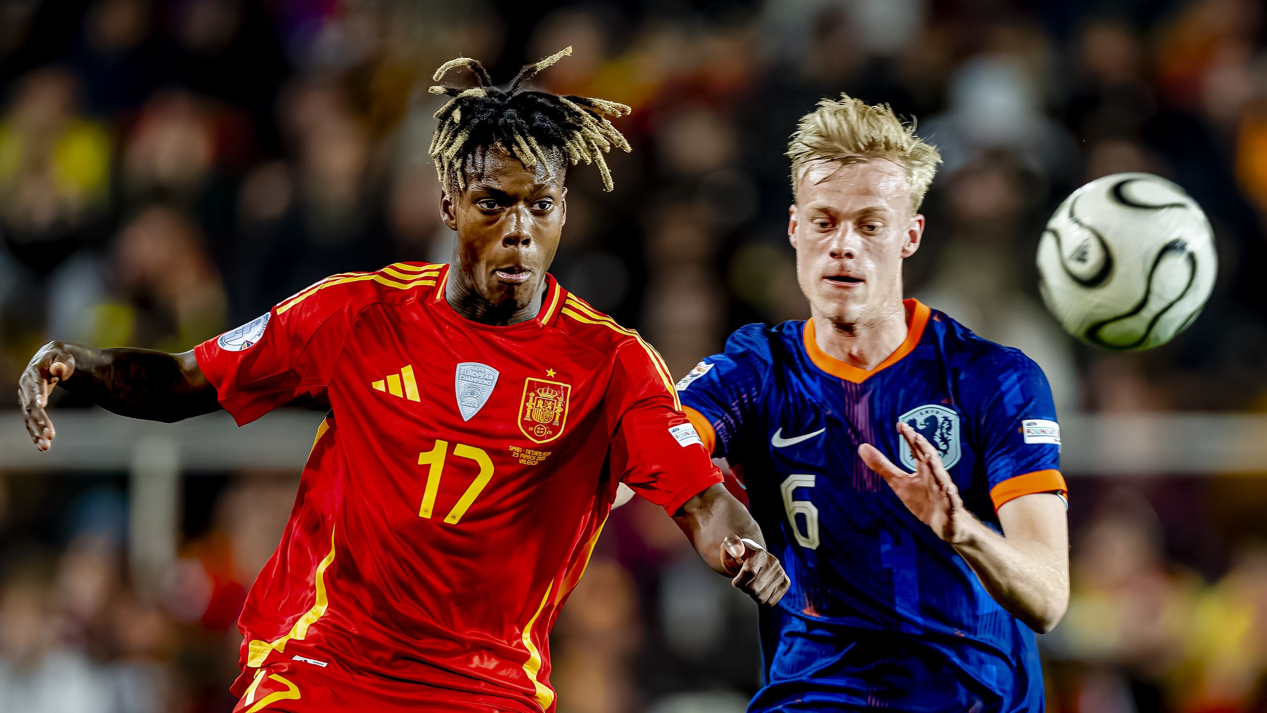 Cada jugada que tiene España la pelota se busca a Lamine o Nico para conseguir desbordar a sus rivales aunque lleven desde el inicio.